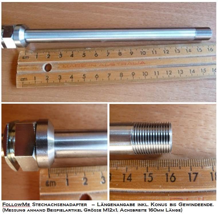 Der Steckachsadapter ersetzt die Standardsteckachse mit diesen Maßen und bietet beidseitig eine Aufnahme für den Fritz-Cargo Transportanhänger.
