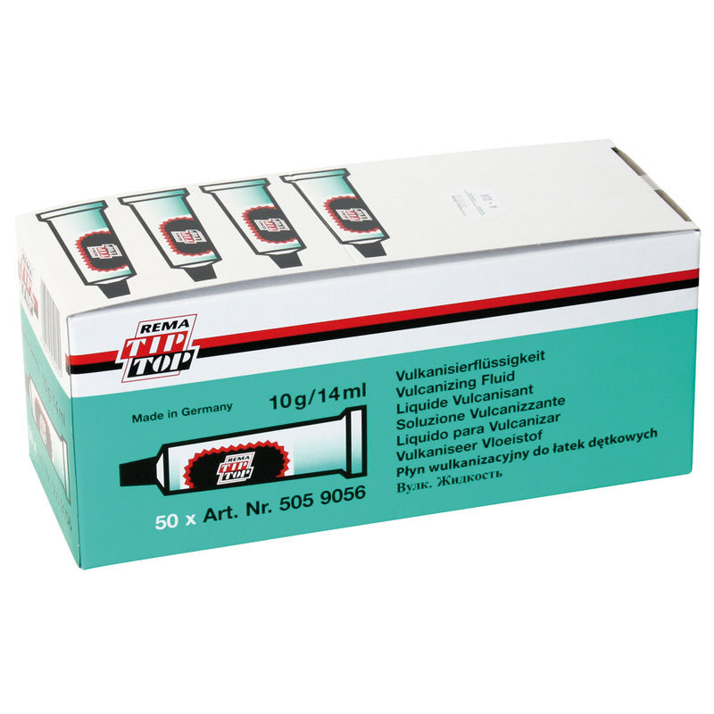 Tip Top Vulkanisierflüssigkeit ist erhältlich in unterschiedlichen Tubengrößen von 5Gramm bis 50Gramm, sowie in größeren Gebinden zum Nachfüllen oder mit Pinseldeckel zum direkten Aufbringen.
